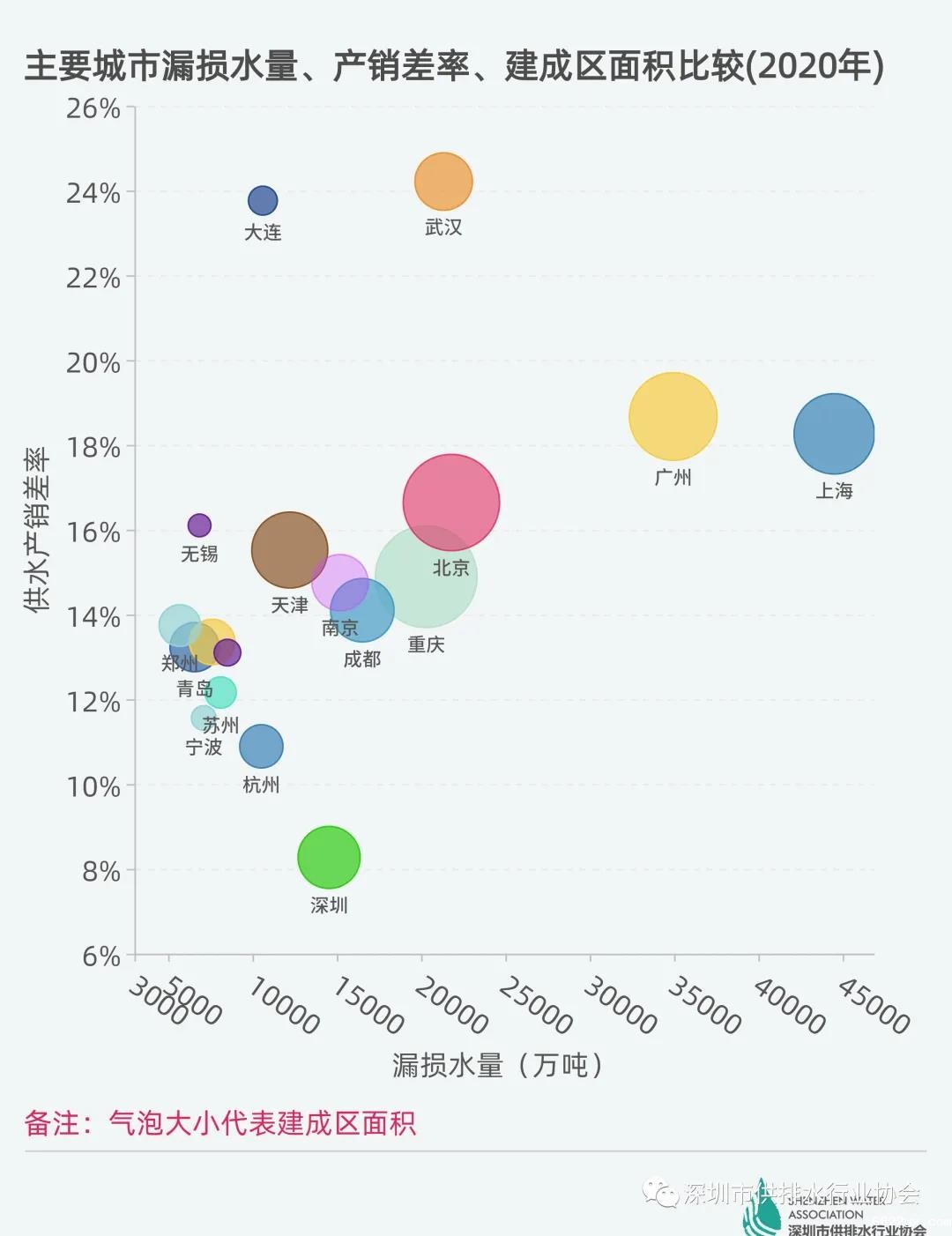 一般而言,在各大城市中,居民家庭用水在售水总量中所占比例最大,尽管这些主要城市在售水总量上差异很大,但在用水结构的比例上趋向一致。分析售水的市场结构,对于预测城市未来用水需求,合理制订水价体系,科学制定城市供水发展规划,具有指导作用。我们将继续引入漏损水量和城市建成区面积两类数据,并且把它们和产销差率一同比较。