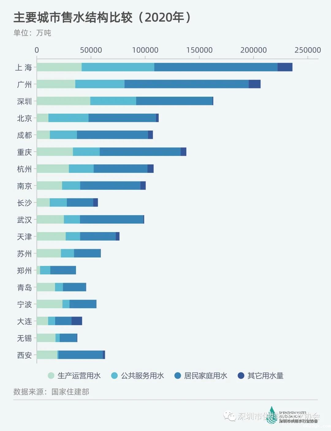 除了各地的供水量、售水量以外,《年鉴》中还统计了多项供水数据,所以,为了更好地比较城市之间的用水情况,我们接下来引入生产运营用水量、公共服务用水量、居民家庭用水量以及漏损水量等数据: