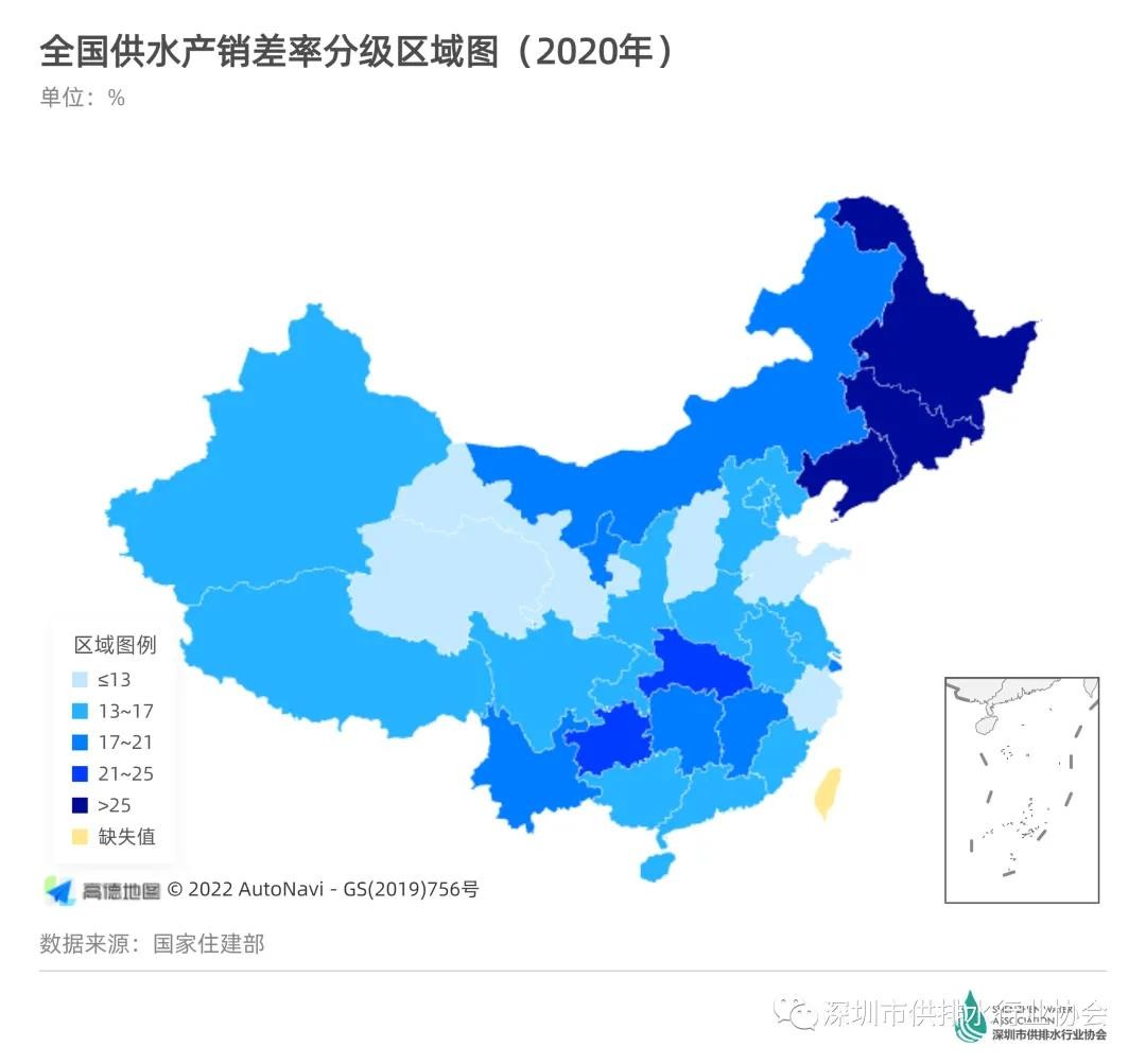 2020年全国公共供水的产销差率是16.24%,其中,各省、直辖市的差异很大,如下图: