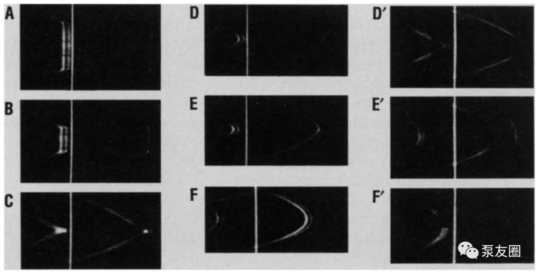 图3 从feco条纹图样(图2)和直接光学显微镜观察可以确定,两个弯曲云母表面以逐渐增加的分离速度分离的示意图(19,20)。最有可能发生反冲和空蚀的地方用星号 (*) 表示。(上) v
