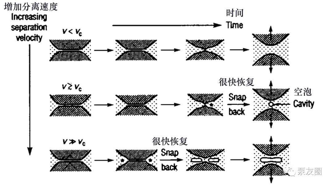 刚刚描述的过程表明,在足够高的分离速度下,两个接触表面没有足够的时间从它们最初的弯曲或扁平状态弹性释放——即使它们没有接触而是被非常薄的液体膜隔开。因此,在距中心有限的径向距离处达到最大负压,并且在此处,表面突然反弹(反冲),形成空泡(但不一定破裂),并发生损坏。