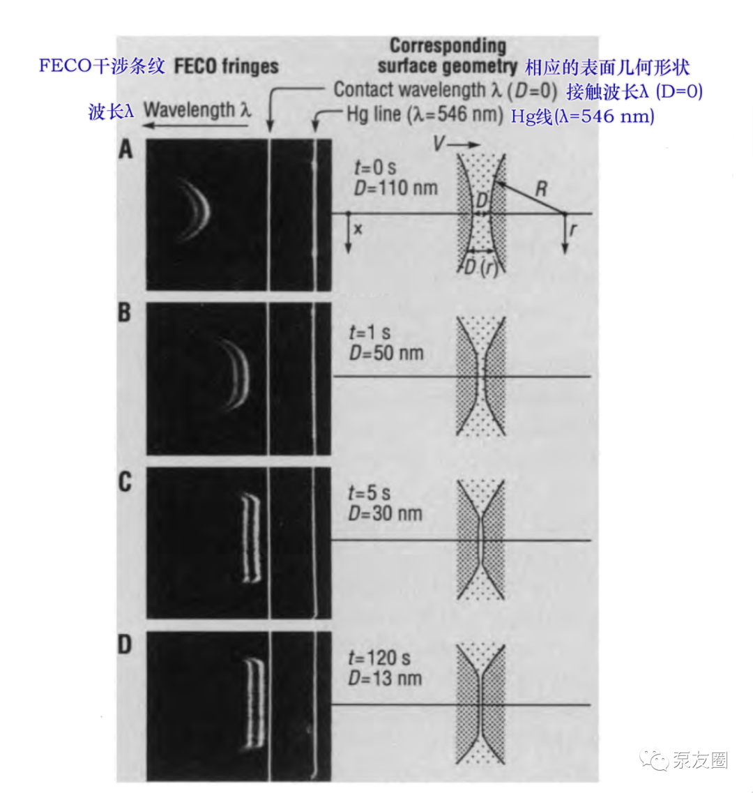 图1显示了 pbd 中粘度为 180 p的两个接近表面的 feco 条纹图案随时间变化。最初(图 1a)表面以稳定的速度 v 相互接近但不变形。当表面相距约 50 nm 时(图 1b),由于支撑材料的扁平化和压缩,它们开始相对于彼此减速。