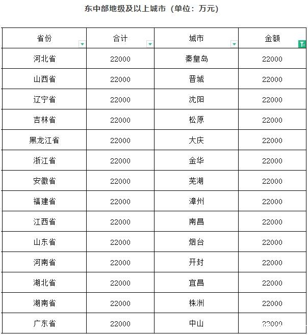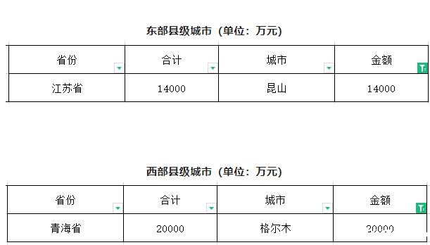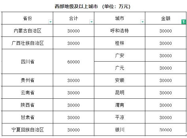 此次下达14个东、中部地级及以上城市,每个2.2亿元;9个西部地级及以上城市每个3亿元;东部县级城市1.4亿元;西部县级城市2亿元。