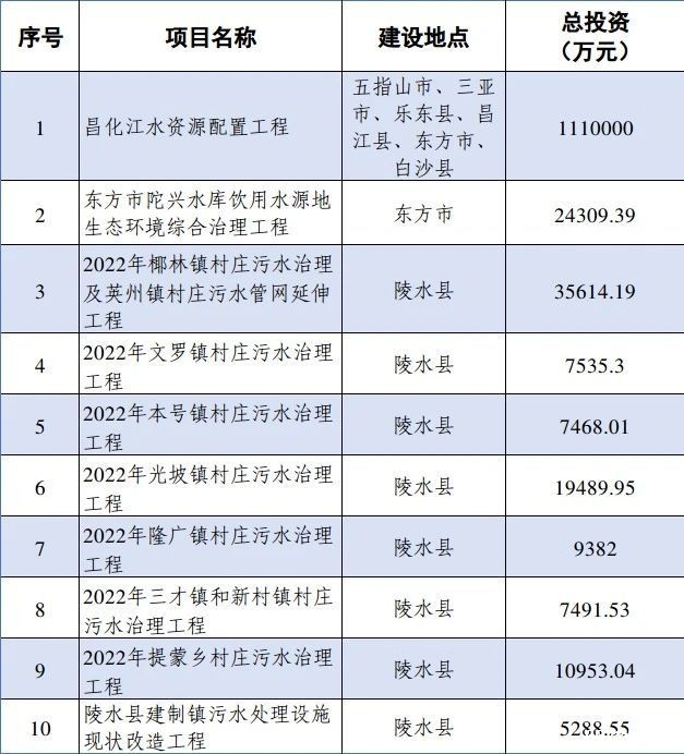 项目包括昌化江水资源配置工程、东方市陀兴水库饮用水源地生态环境综合治理工程、2022年椰林镇村庄污水治理及英州镇村庄污水管网延伸工程、2022年文罗镇村庄污水治理工程、2022年本号镇村庄污水治理工程、2022年光坡镇村庄污水治理工程、2022年隆广镇村庄污水治理工程、2022年三才镇和新村镇村庄污水治理工程、2022年提蒙乡村庄污水治理工程以及陵水县建制镇污水处理设施现状改造工程等10个项目,总投资约124亿元。