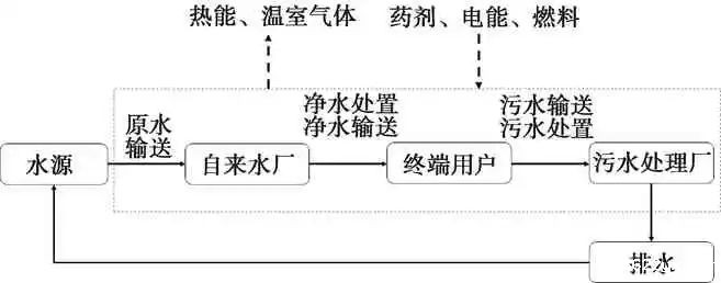 由水源处取得的原水在经过原水管网输送、水厂处理、供水管网输送后送入千家万户。原水管网输送、供水管网输送过程中需通过多级泵站、泵房处理,此过程中水泵消耗电能的间接排放是主要的温室气体排放形式。水厂处理过程中一般不直接排放温室气体,其间接排放源于设备运行产生的能耗,以及预处理环节加氯、絮凝剂和消毒剂投加产生的药耗。