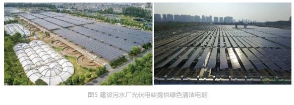国内污水厂的耗电量普遍达0.29 kW·h/m3,相较于美国的污水厂耗电量(0.2 kW·h/m3)而言,该数据显然远超发达国家。通过工艺改进,在降低单位废水处理耗电量的同时,减少的单位电耗碳排放量将有助于降低厂区整体碳排放量。污水厂占地较大、楼层较低,采用太阳能、风能等新能源将有助于减少厂区所用市电需求量(图5),Goswami等研究了在污水处理系统中开发浮动太阳能光伏(FSPV)系统,将光伏组件漂浮在水面上实现太阳能发电,15 MW太阳能光伏系统可向电网供能26 465.7 MW·h/年,减少蒸发788万m3的水,减少CO2排放量近52万t,有助于污水厂向可持续发展转型。刘玉涛等对山东某地下污水厂开展实例分析,论证了通过建设包含光伏发电、沼气发电等在内的多能互补综合能源系统,可实现污水厂的稳定供电,每年可节约标准煤2 855 t,减排CO2以及其他大气污染物排放7 699 t。