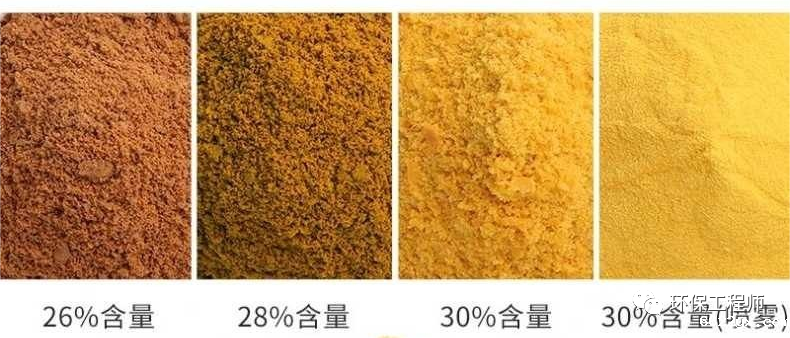 因生产工艺和原材料不同,生产出来的PAC颜色也有些差别,一般有白色、淡黄色、金黄色、褐色、棕色、咖色这六种颜色的聚氯化铝。